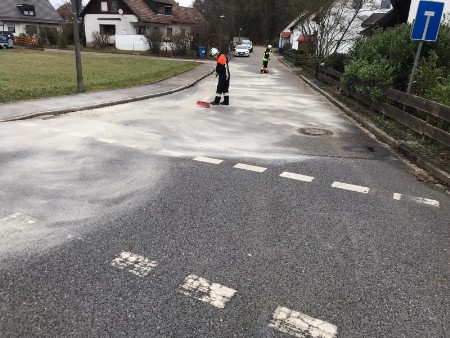 Unsere Aufgabe: Binden und und abkehren mit 2 Säcke Ölbinder um größeren Umweltschaden zu verhindern.geehrt.