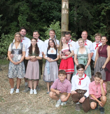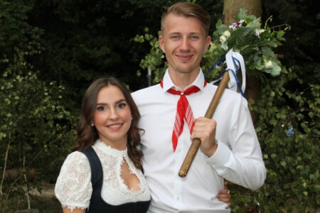 Am Samstagvormittag wurde der gut 25 Meter hohe Kirchweihbaum aufgestellt. Kränze und Baumspitze waren zuvor von den Madln prächtig geschmückt worden und zur „Krönung“ im wahrsten Wortsinn erhielt die Spitze noch eine Solar-LED-Beleuchtung, die den Baum auch in der Nacht erstrahlen ließ.