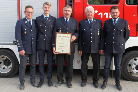 Auch die treue Mitgliedschaft einiger fördernden Mitglieder und deren langjährige ehrenamtliche Tätigkeit auf vielen Ebenen wurde gewürdigt, Werner Schwarz für 50 Jahre, Helmut Nerreter für 45, sowie Bernhard Zier, Johann Raab und Dieter Czerkus für 40 Jahre. Für weitaus mehr Mitgliedsjahre und jahrzehntelange ehrenamtliche Tätigkeit wurden die längst passiven Feuerwehrmänner ausgezeichnet: Ehrenvorstand Hermann Roth (65 Jahre Mitgliedschaft), Ehrenmitglieder Georg Roth und Robert Koch und Ehrenkommandant Christian Rupprecht (alle 65), Ehrenmitglieder Karl Löwe (60) und Hans Krauß (55), Alfons Lang (50) und Georg Bräunlein für 45 Jahre. Günther Schwarz ehrte