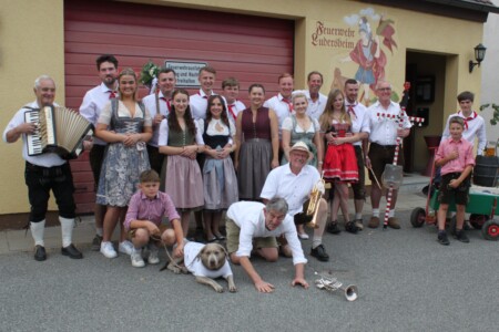 Vor dem Austanzen wurden sechs Kirchweihpaare von den Namenlosen abgeholt. Die „Rolle“ des Betzn übernahm Labradorhündin Amelie, supportet vom Trompeten-Joe der Namenlosen und begleitet von drei Jungfeuerwehr-Anwärtern.