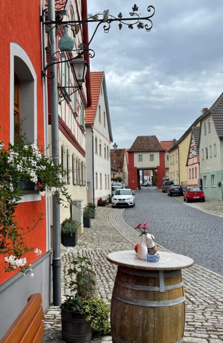 Den weiteren Verlauf hatte Vereinsmitglied Wolfgang Schwarz gut vorbereitet. Zu Fuß machten sich die Ausflügler auf den Weg nach Markt Einersheim, wo man sich im Gasthaus Rotes Ross zum wohlschmeckenden Mittagsmahl einfand. Der pittoreske Ort mit zwei alten Stadttoren gefiel auch wegen schöner Fachwerkbauten. Der Weg nördlich der Bahnstrecke nach Würzburg führte die Wanderer noch vor dem Ortseingang von Iphofen zum Weingut Emmerich. Im Obstbaumgarten des