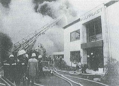 Alle benachbarten Feuerwehren und die Flughafenfeuerwehr Nürnberg wurden zur Unterstützung alarmiert. Große Rauchwolken stiegen auf. Wegen der verbrannten Kunststoffe bestand die Gefahr gesundheitlicher Beeinträchtigung. Die Wehrmänner mussten Atemschutz einsetzen. Die Bevölkerung wurde mit aktuellen Radiodurchsagen gewarnt. Die Löschwasserversorgung über das Hydrantennetz reichte nicht mehr aus, weswegen es erforderlich war, eine lange Schlaustrecke vom Löschweiher aufzubauen. Mengen von Schaummitteln waren erforderlich, um den Brand auf die Produktionshalle zu begrenzen, und das Übergreifen auf die anderen Gebäude zu verhindern. Selbst der Einsatz eines Baggers war erforderlich, um das Blechdach abzuziehen, damit die Brand- und Glutherde erreichbar wurden. Der Einsatz dauerte mehrere Stunden. Nachdem die Reste der Halle zur Erleichterung des Wiederaufbaus entfernt waren, überfluteten starke Regenfälle den noch stehenden Altbau und die Feuerwehr musste erneut ausrücken. Durch Anbringen von Dachrinnen, Ableiten von Oberflächenwasser und Aufbauen von Wasserdämmen konnte auch hier geholfen werden.